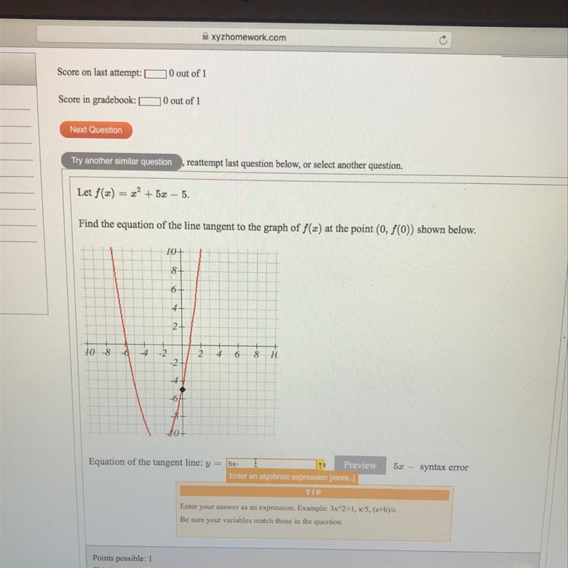 Find the eqn. of the tangent line to the curve of f(x) = x^2 + 5x -5 at (0,-5).