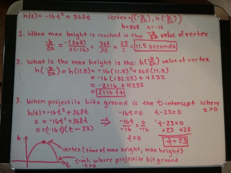 H=-16t^2+368 1. what does the ash projectile reach its maximum height? 2.What is the maximum height? 3. when does the ash return to the ground?