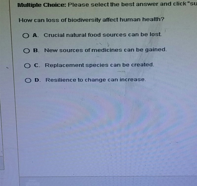 I believe the answer would be that crucial natural food sources can be lost. As biodiversity connects all living things, if there were to be a loss, then there would be a major affect on the food web, which would cause natural food sources, such as chicken, to be lost. Henceforth, the answer would be a, or crucial natural food sources can be lost.