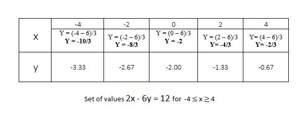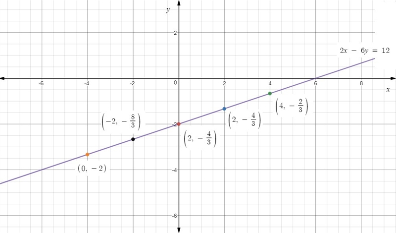 Refer to the equation 2 x − 6 y = 12. (a) Create a table of values for at least 4 points. Show your work. (b) Use the table of values to graph the line. **Please answer A and B**