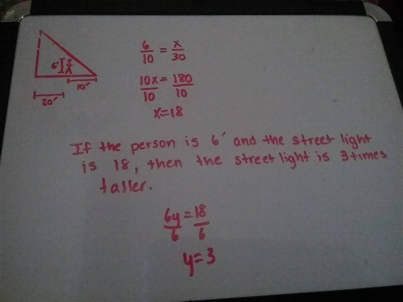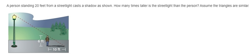 A person standing 20 feet from a street light casts a 10 foot shadow. How many times taller is the streetlight than the person? Assume the triangles are similar.