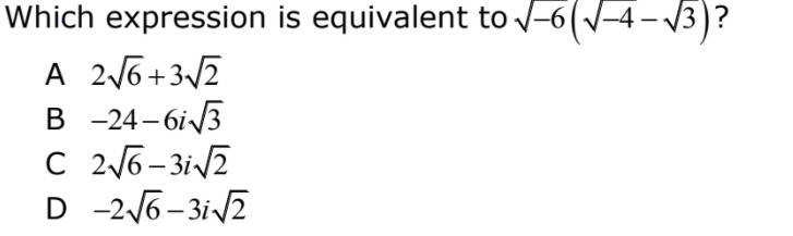 i(2i√6 - 3√2) = -3i√2-2√6 Distribute i over (2i)√6 - 3√2