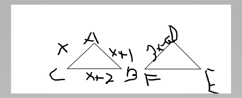 The triangles below are congruent, with △ABC ≅ △DEF. The following lengths are given in centimeters: AB= x + 1, AC= x, BC= x + 2, and DF= 3x − 8. What is the value of x?