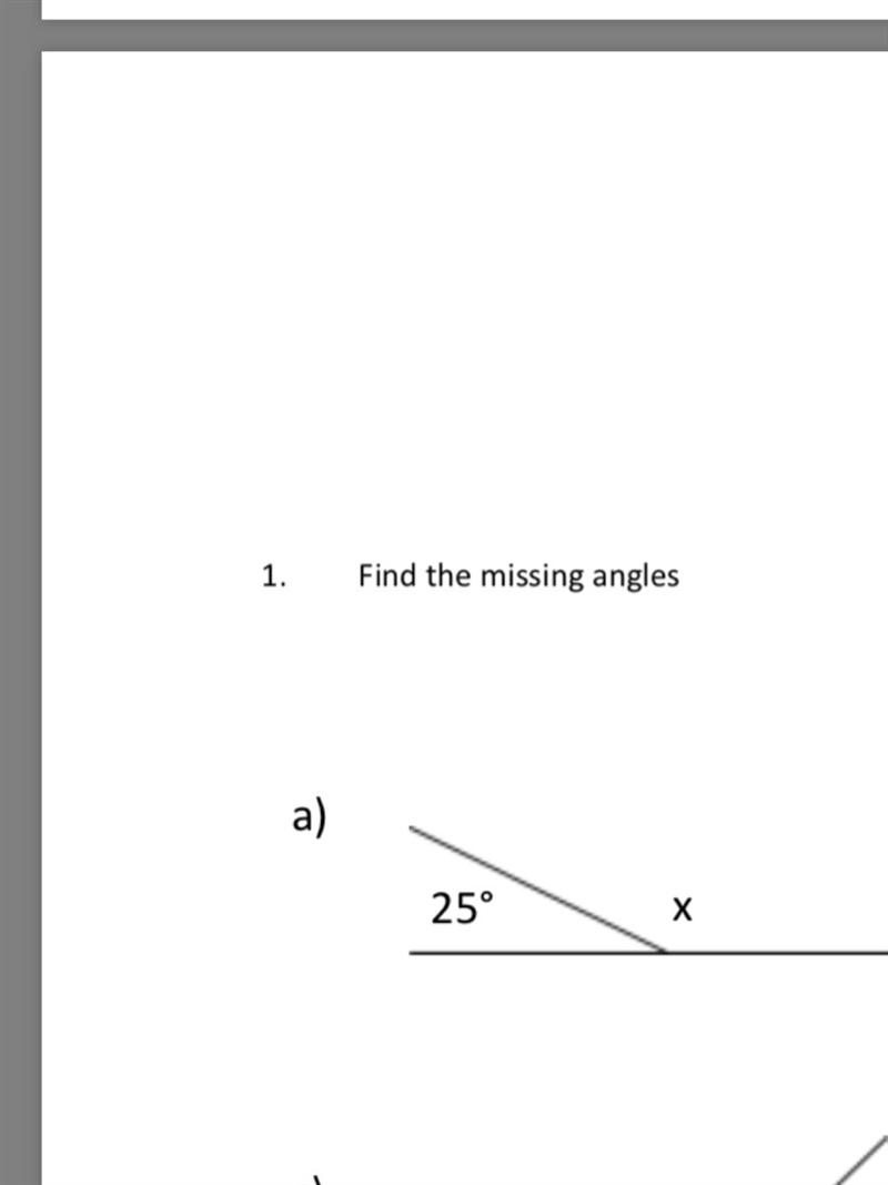 The missing angle would be equal to 155 degrees. This can be found because the two angles must add up to 180 degrees, as they create a straight line. 180-25=155, so the missing angle must equal 155 degrees.