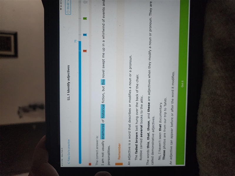 What are three adjectives in this sentence I️ am usually enamored of historical fiction but this novel swept me up in a whirlwind of events and personalities