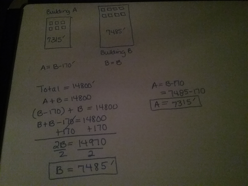 Building A is 170 feet shorter then than building B. the total height of the building is 14800. find the height of each building