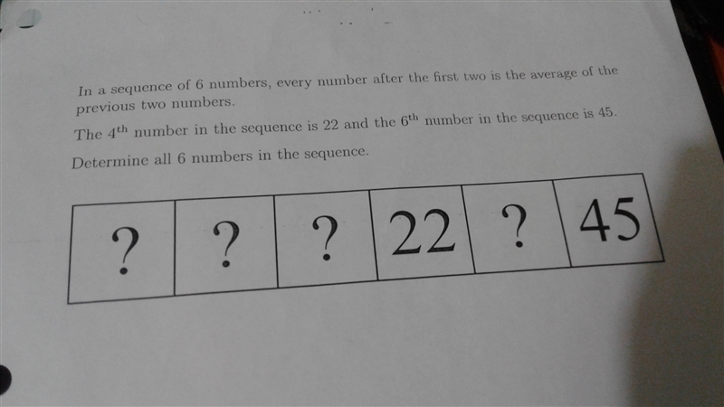 298, -70, 114, 22, 68, 45 Let's start with our initial sequence. a, b, c, 22, e, 45 Since the average of 22 and e is equal to 45, we have (22 + e)/2 = 45 22 + e = 90 e = 68 So our sequence is now a, b, c, 22, 68, 45 And since 68 is the average of c and 22, we have 68 = (c + 22)/2 136 = c + 22 114 = c So our sequence is now a, b, 114, 22, 68, 45 And b becomes 22 = (b + 114)/2 44 = b + 114 -70 = b So our sequence is now a, -70, 114, 22, 68, 45 And finally, for a, we have 114 = (-70 + a)/2 228 = -70 + a 298 = a So the final sequence becomes 298, -70, 114, 22, 68, 45