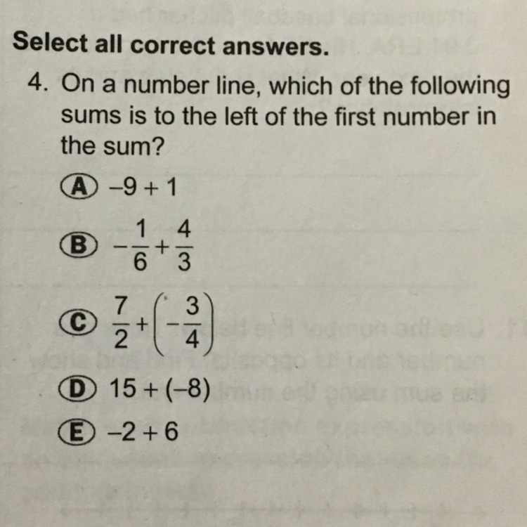 The correct answer would be D, if you were to add the numbers, the sum of the numbers must be to the left of the first number in the expression, meaning it must be less than the first number of the expression. In answer choice D, the sum of 15+(-8) is 7, and since 7 is less than 15, it is to the left of 15 which makes choice D the answer.