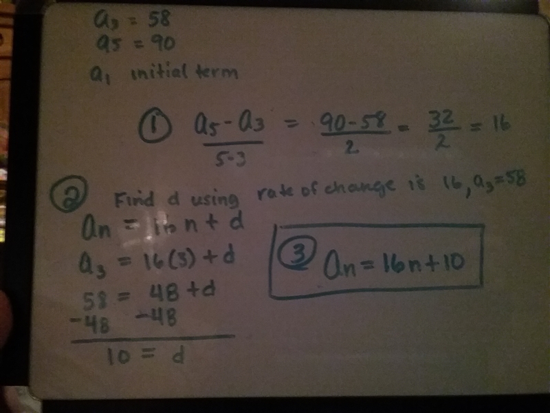 The third term in an arithmetic sequence is 58 and the fifth term is 90. if the first term is a1, which is an equation for the nth term of this sequence? 1. an = 8n + 10 2. an = 8n − 14 3. an = 16n + 10 4. an = 16n − 38