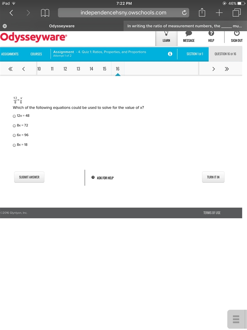 8x=72 because you have to cross multiply. The full answer should be x=9.