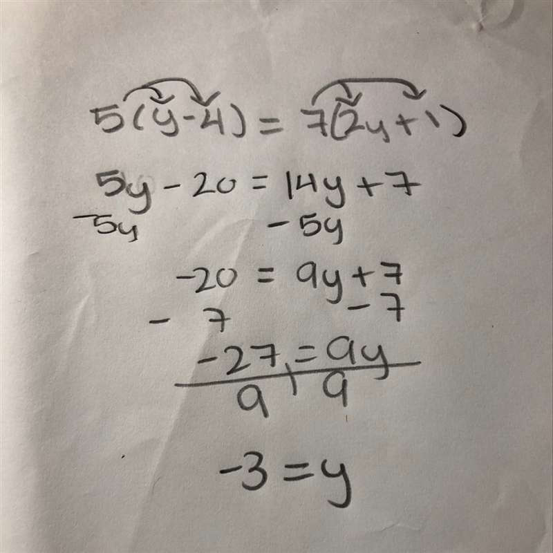 Solving equations with variables on both sides. Check answer pls 5(y-4)=7(2y+1) Can you also show the work Pls & thank you