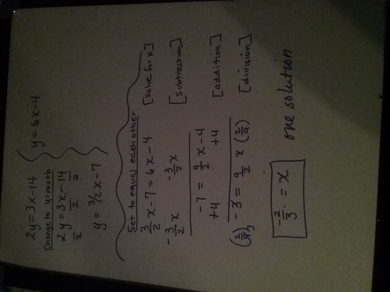 A system of equations is graphed on the coordinate plane. 2y=3x−14 y=6x−2 A. No solution B. One solution C. Infinitely many solutions