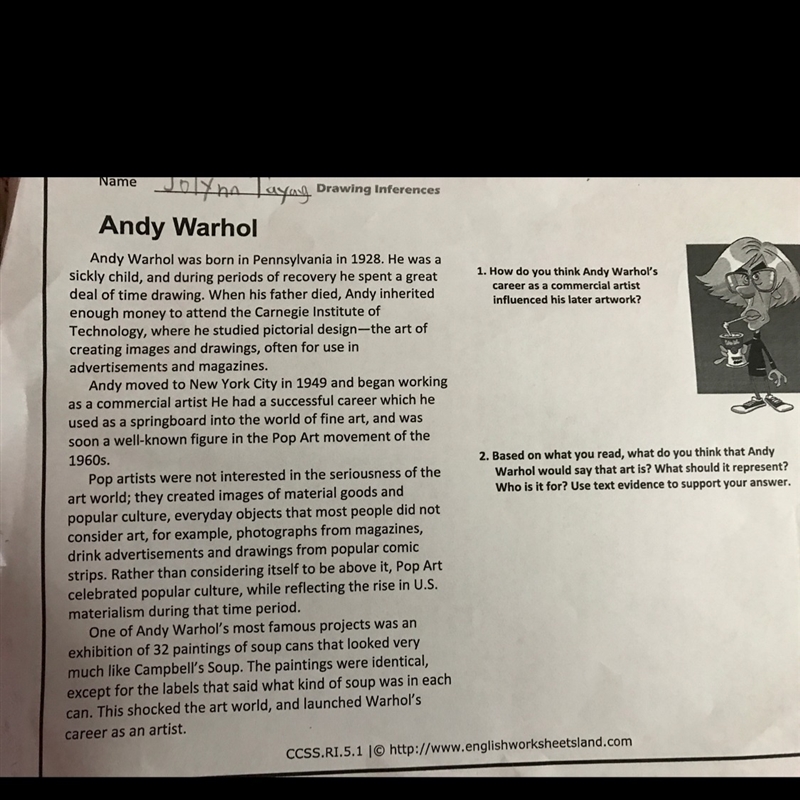 2.Art is entertainment, different from what you see,the dances of images.İt represents nothing special like a concrete message.It appeals to our vision and enjoyment.Art is for popular culture which means for ordinary people.They see and enjoy it and it becomes popular for them.His exhibition of 32 paintings of sour cans is an evidence which shows his art is different from what we think,doesn't give a message or eccentric and funny in a way.Soup cans are ordinary products but they make an art,which is quite interesting.