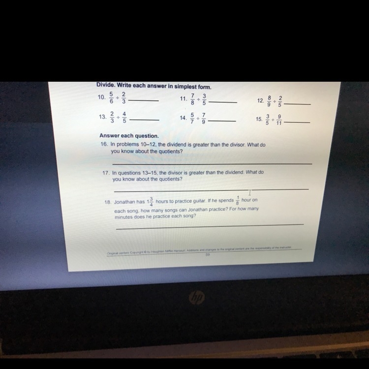 Divide 5/6 by 2/3 by inverting (turning upside down) that 2/3 and then multiplying: