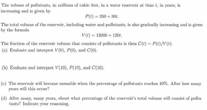 So pollutants make up about 3% of the total volume in the reservoir at time t = 0.