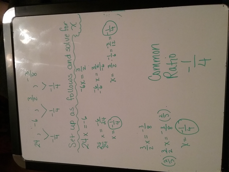 What is the common ratio for the geometric sequence? 24,−6,3/2,−3/8,... Enter your answer in the box.