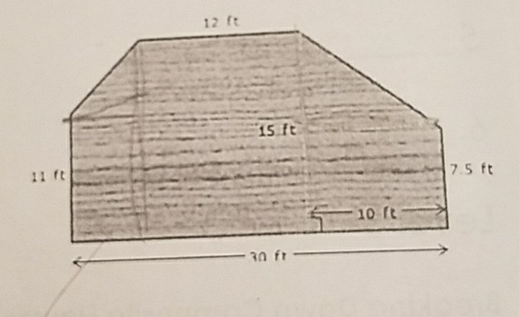 Divide the figure using vertical lines into 3 sub-areas. You have already done this on the left side of the figure. The base of this trapezoid is (30-10 -12) ft, or 8 ft. The trapezoid has 2 heights shown: one is 11 ft and the other is 15 ft.