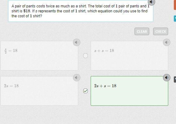 A pair of pants costs twice as much as a shirt. The total cost of 1 pair of pants and 11 shirt is $18. If s represents the cost of 1 shirt, which equation could you use to find the cost of 1 shirt?