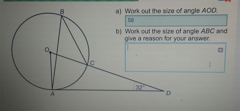 AOD = 180 - (90+32) = 58 because when a tangent meets a radius they form a right angle