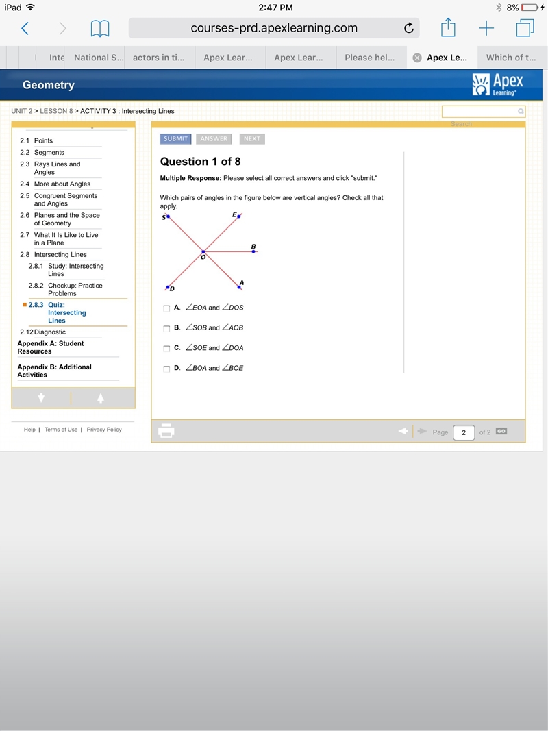 A and C are the answers. Vertical angles are opposite angles made from the same 2 crossing lines.