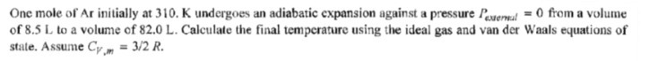 One mole of ar initially at 305 k undergoes an adiabatic expansion against a pressure pexternal = 0 from a volume of 8.5 l to a volume of 82.0 l. part a