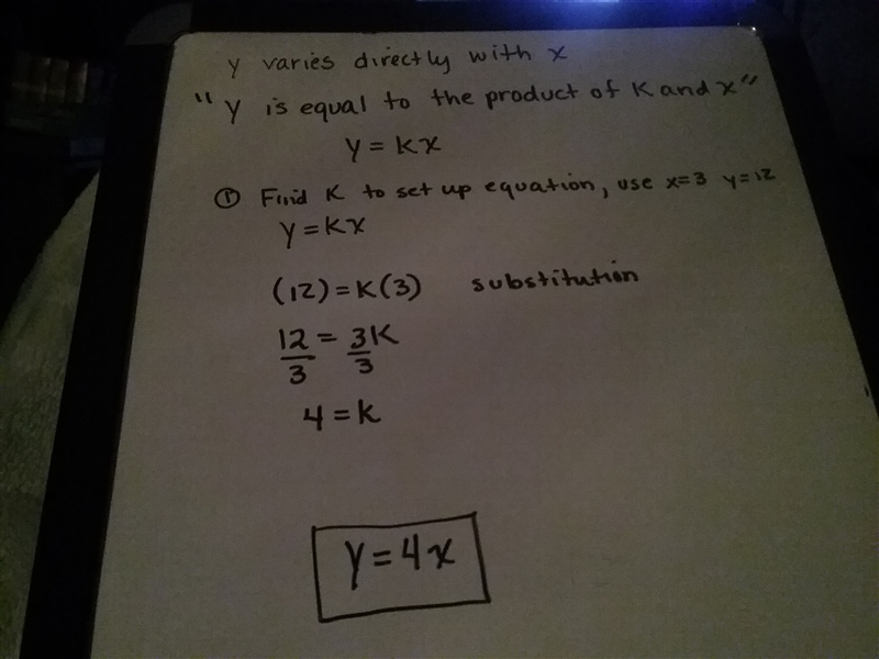 The variables x and y vary directly. if one pair of the values is x = 3 and y = 12, write an equation that shows the relationship between x and y.