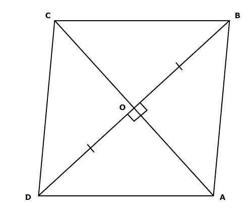 ∠ AOB = ∠ AOD = 90° (diagonals are perpendicular)