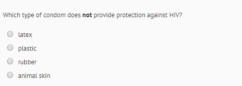 Which type of condom does not provide protection against HIV? A. Latex B. Plastic C. Rubber D. Animal Skin