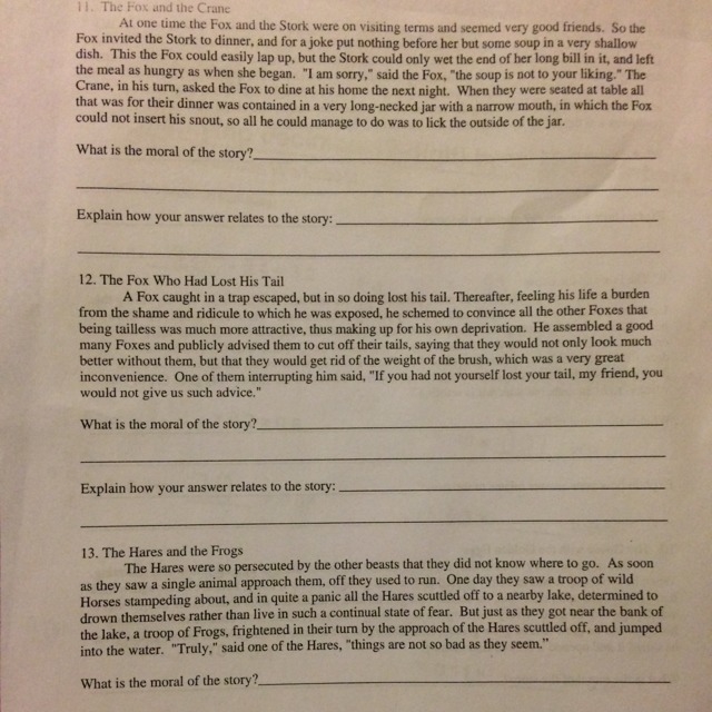 the theme for the fox and the crane is "do not play tricks on your neighbor unless you can stand the same treatment yourself" this answer relates to the story because the fox treated the crane badly but he expected her to give him a proper dinner. for the second story, the theme is "do not listen to the advice of someone who wants to lower you to their own level" this relates to the story because the fox is trying to get all the foxes to cut their tails off so he would not be the only one who is made fun of. the moral of the last story is "there is always someone who is worse off than yourself/others" this relates to the story because the hares are scared of everything that comes in their path...they are one of the creatures that fear almost everything