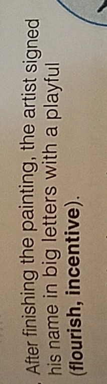 Which word goes in the blank After finishing the painting, the artist signed his name in big letters with a playful ______ flourish or incentive