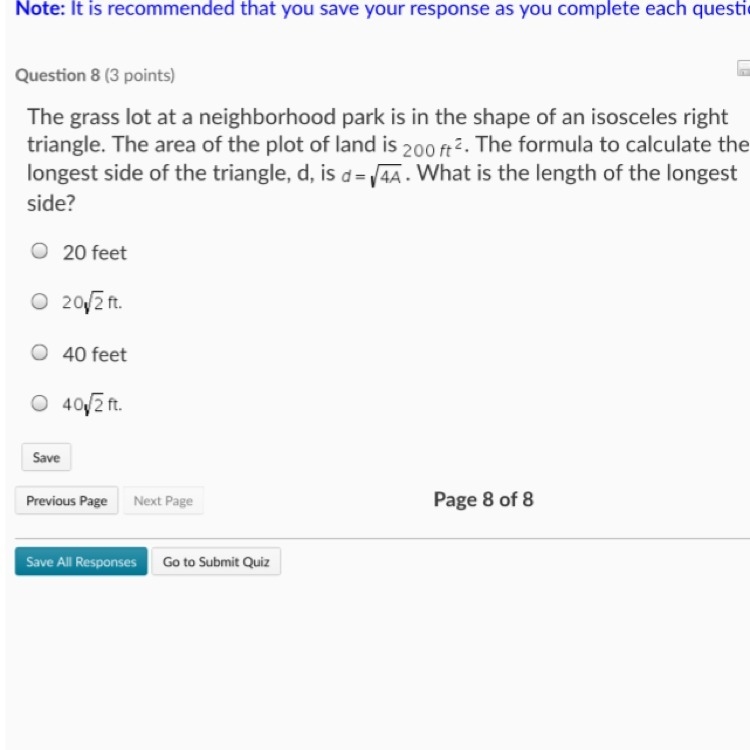 Answer: Choice B) 20*sqrt(2) ft