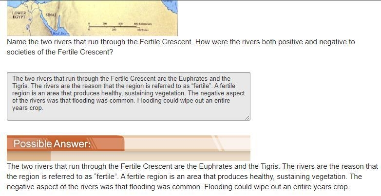 The two rivers that run through the Fertile Crescent are the Euphrates and the Tigris. The rivers are the reason that the region is referred to as “fertile”. A fertile region is an area that produces healthy, sustaining vegetation. The negative aspect of the rivers was that flooding was common. Flooding could wipe out an entire years crop.