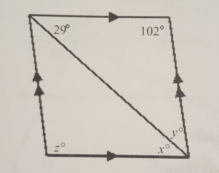 Find the values of the variables in the parallelogram. The diagram is not to scale. A. x = 49, y = 29, z = 102 B. x = 29, y = 49, z = 131 C. x = 49, y = 49, z = 131 D. x = 29, y…