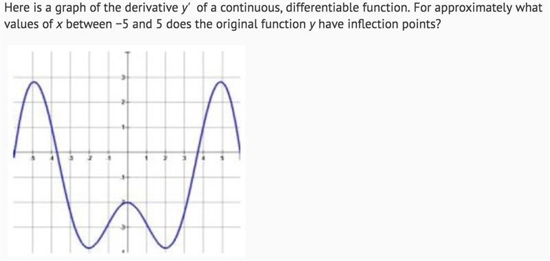 This is a question about inflection points. I see that there are a total of 5 maxima and minima, and I know that inflection points happen when there are maxima and minima in the first derivative. I currently think that the fourth answer is the best but something doesn't feel right about it for some reason.