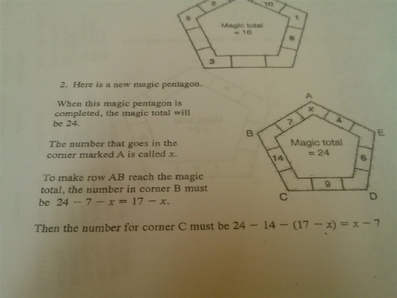 How to solve this? In a magic pentagon, the three numbers along each of the five sides add up to the sane total. We call this the "Magic Total". For example, "x+7…