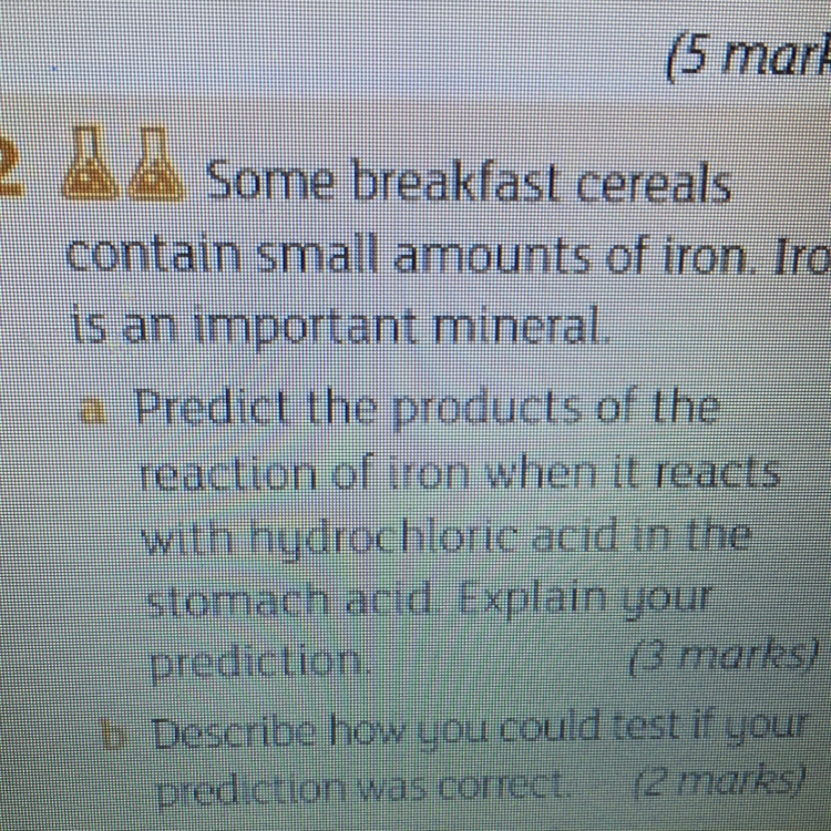 (A) iron + hydrochloric acid --> iron chloride + hydrogen. Hydrochloric acid (HCl) separates into H+ and Cl- ions. The Cl- ions bond ionically with the iron creating a stable compound and the H+ ions pair up stablaising the H ions