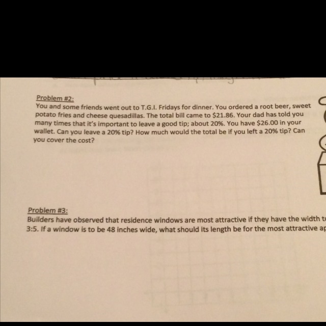 You and some friends went out to t.g.i. Fridays for dinner. You ordered a root beer,sweet potato fries and cheese quesadillas. The total bill came to $21.86. your dad told you many times that it's important to leave a good tip about 20%. You have $26.00 In your wallet. Can you leave a 20% Tip? How much would the total be if you Left a 20% tip? Can you cover the cost?