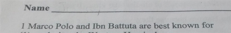 Marco Polo and Ibn Battuta are best known for (1) exploring the Western Hemisphere (2) leading religious movements (3) opening trade between Africa and Japan (4) providing extensive information about lands