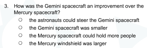 The goal of this project was to orbit the Earth and dock with another spacecraft. Question 2 options: Gemini International Space Station Mercury Apollo