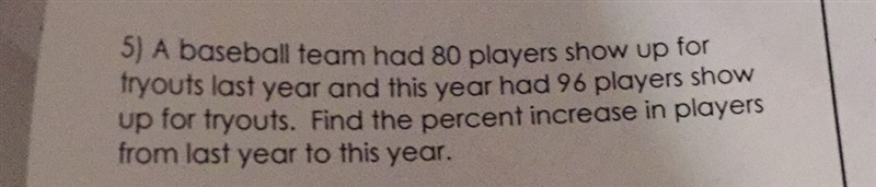 A baseball team had 80 players show up for tryouts last year and this year had 96 show up for tryouts Find the percent increase from last year to this year 4