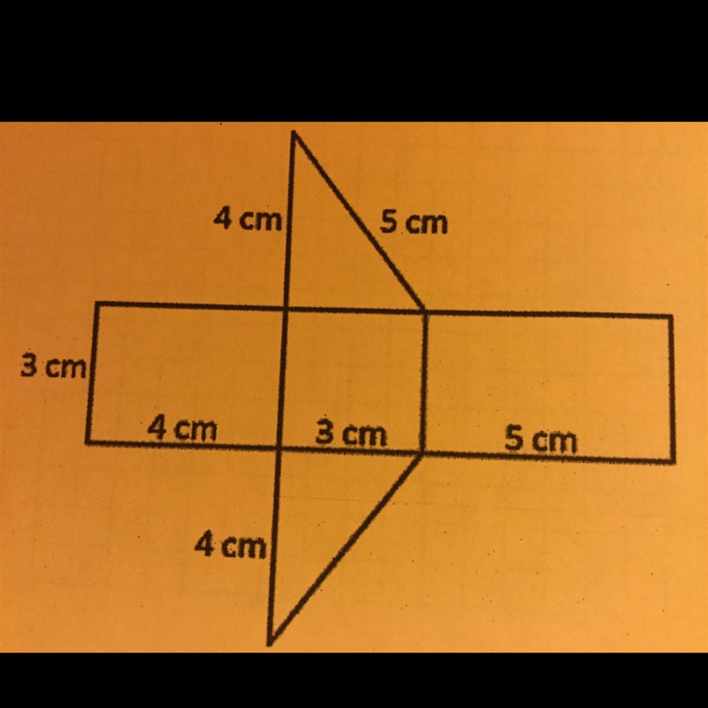 Again, the right side of the rectangle is also 3 cm, because it's across from another side that measures 3 cm. 3 cm * 5 cm = 15 sq cm. Now, let's move on to the bottom triangle. The area of a triangle is one-half times the base times the height. The base is 3 cm, and the height is 4 cm. 1/2 * 3 cm * 4 cm = 1/2 * 12 sq cm = 6 sq cm. The top triangle is exactly the same as (AKA congruent to) the bottom one, so it's also 6 sq cm. Let's add up the areas of these faces: 12+9+15+6+6=48 sq cm. This is the surface area!
