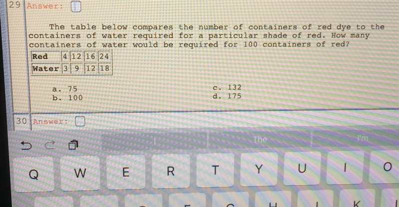 From the table, for every 6 containers of water, you need 8 containers of red dye. So, for every one container of red dye you need 0.75 containers of water (6/8). Then, multiply that by 100 (since you wanted to know water necessary for 100 containers of red dye). For 100 containers of red dye, you would need 75 containers of water.
