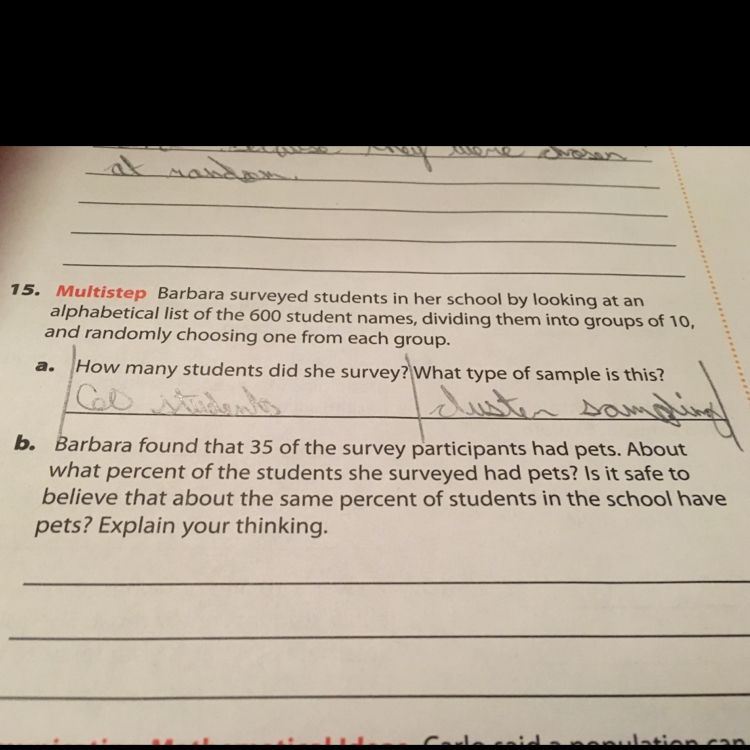 Around 58%. It is safe to believe that about the same percentage of students in the school have pets. This is because they are split in groups of 10 and they can be represented as part of a whole, in this case the surveyed students are part and the whole school is the school.