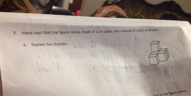 Joyce says that the figure below, made of 1 cm cubes, has a volume of 5 cubic centimeters. a. Explain her mistake Pls Help!