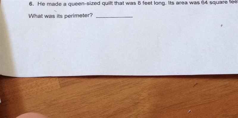 6. He made a queen-sized quilt that was 8 feet was 64 square feet Its area long. What was its perimeter?