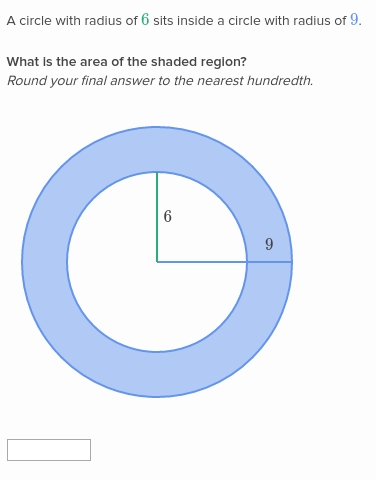 We have 2 circles. If we find the area of both then subtract the area of the smaller circle, that will leave us with the area of the shaded region.