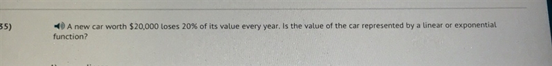 85) A new car worth $20,000 loses 20% of its value every year. Is the value of the car represented by a linear or exponential function?