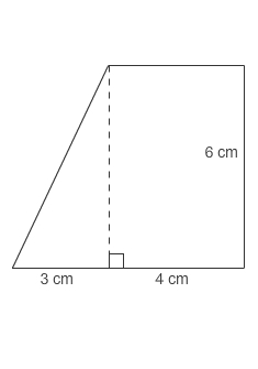What is the area of the figure? Right triangle with a base of three centimeters attached at the right side to a rectangle with a base of four centimeters and a height of six cen…