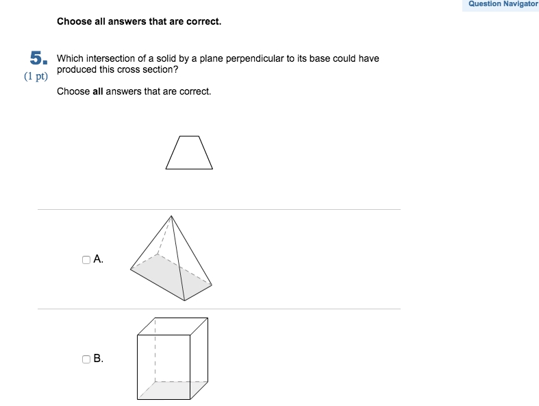 Name: Date: Class: Test: Lessons 18-1 Slicing Solids and 18-2 Lateral and Surface Area of Prisms Circle the term or phrase that best completes each sentence. 1. The figure on the left is a ... triangular
