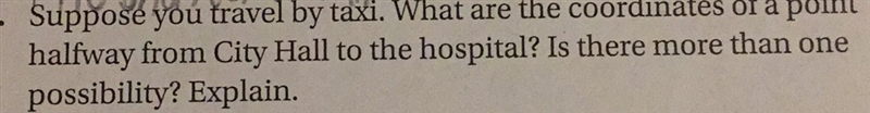 Suppose you travel taxi. What the coordinates a pUllllby are halfway from City Hall to the hospital? Is there more than onepossibility? Explain